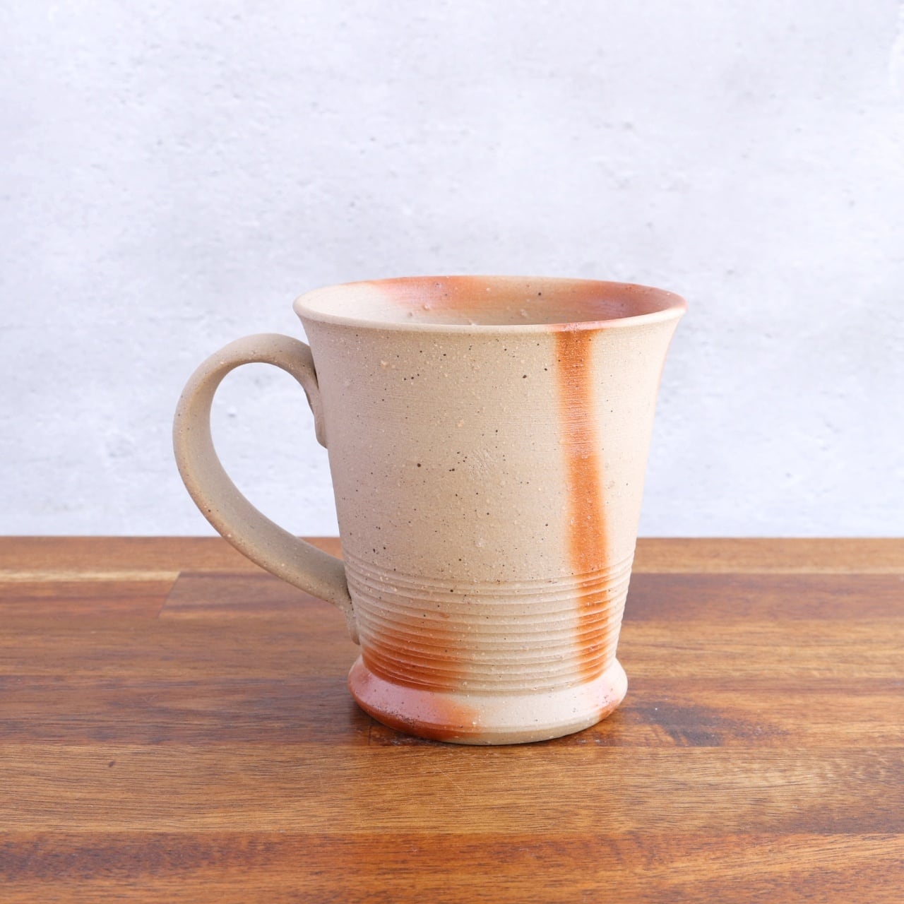 口元にかけて広がった飲み口が特徴的な備前焼のマグカップです。